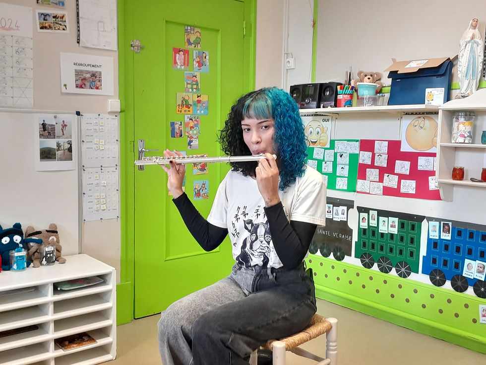 Merci à Sara pour l'initiation à la musique ! Les enfants peuvent ainsi découvrir différents instruments de musique (la flûte traversière, le saxophone, la clarinette, la guitare...) mais aussi faire du rythme et chanter. Bravo à tous !